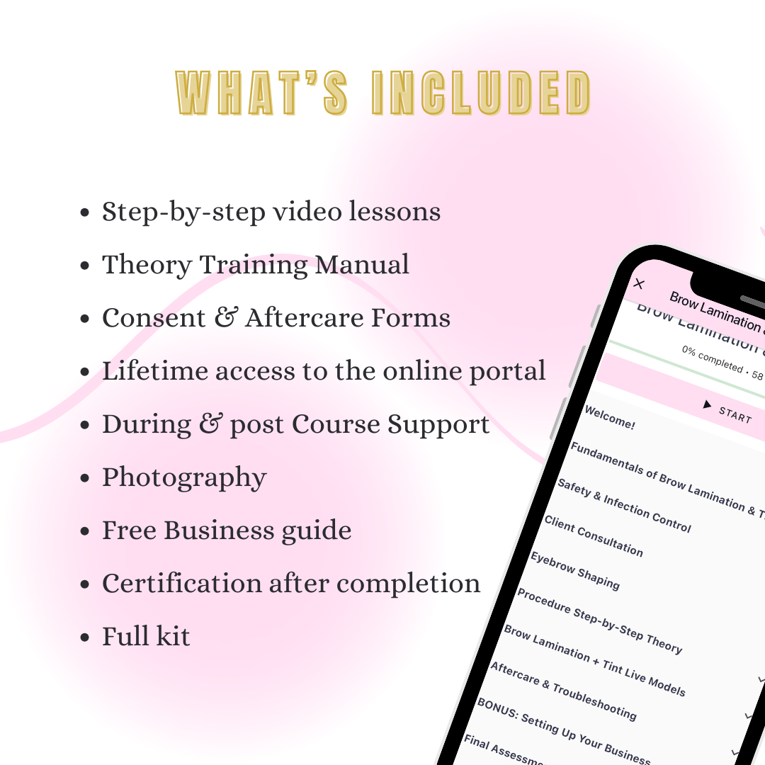 This Comprehensive training covers everything from proper brow mapping and shaping to the Lamination, Tinting, and waxing process, achieving perfect results for each client. This course will give you the knowledge and confidence to deliver long-lasting results while also teaching you steps on how to set up your business from scratch.